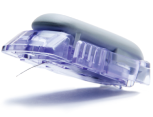 - 皮膚に貼り付けたセンサーから、皮下にごく細い線を挿入し、5分に1回、血糖値を測定する。