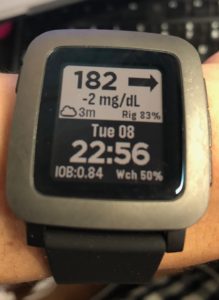 (あらすじ風に)私には時計で時刻を見るように、我が家のイチの血糖値をモニターしたいという希望があったが、今年の夏に参加した、T1Dのキャンプ に参加している夫妻から、Pebbleというスマートウォッチを使えば実現できるという話を聞きつけ、早速買ってみたところ、PebbleはFitbitに買収された結果、対応アプリの配信が停止しまい、新たに使い始めることはできないと判明し、返品を余儀なくされたものの、今年9月頃に、根強いファンの要望が通ったためか、アプリが奇跡の復活を果たし、喜び勇んで再購入し、諸々の設定を行った結果が下記なのであった。