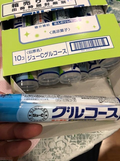 ところで、栄養価については、1本全体の炭水化物はどちらも22.9g、つまり1粒あたり約1.5gと、差はありません。グルコース版は「糖分補給に適した、ブドウ糖を主成分にしています」と記載がありますが、ブドウ糖が主成分である点では、ジューCも同じ。