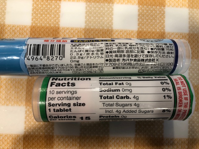 栄養価的には、炭水化物量は、「ジューCタブレット」が一個あたり約1.5グラムに対し、「Glucose Tablets」は4グラム。