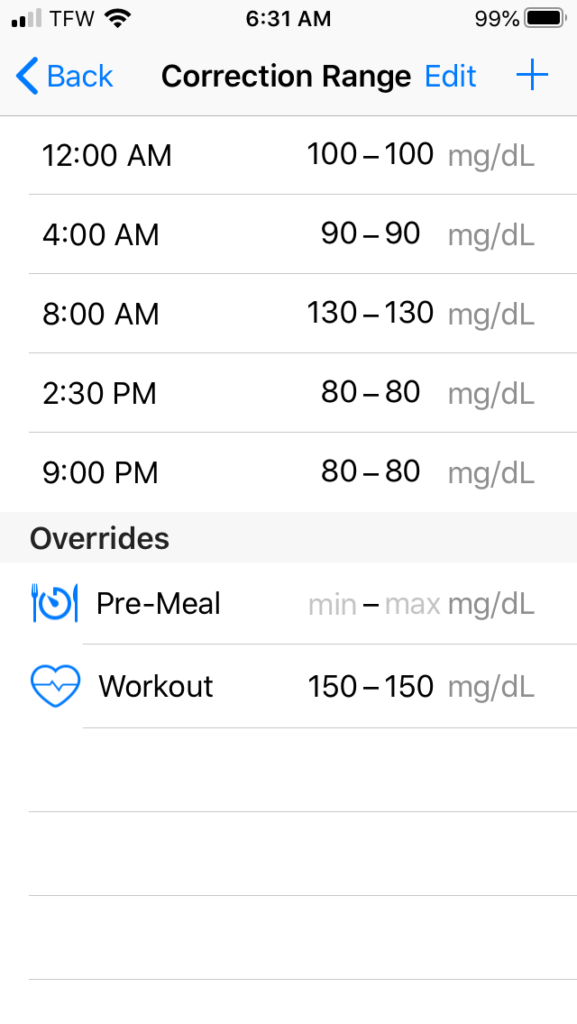 実際のアプリの画面で説明しましょう。こちらが、ターゲット血糖値。こちらも時間ごとに設定可能。