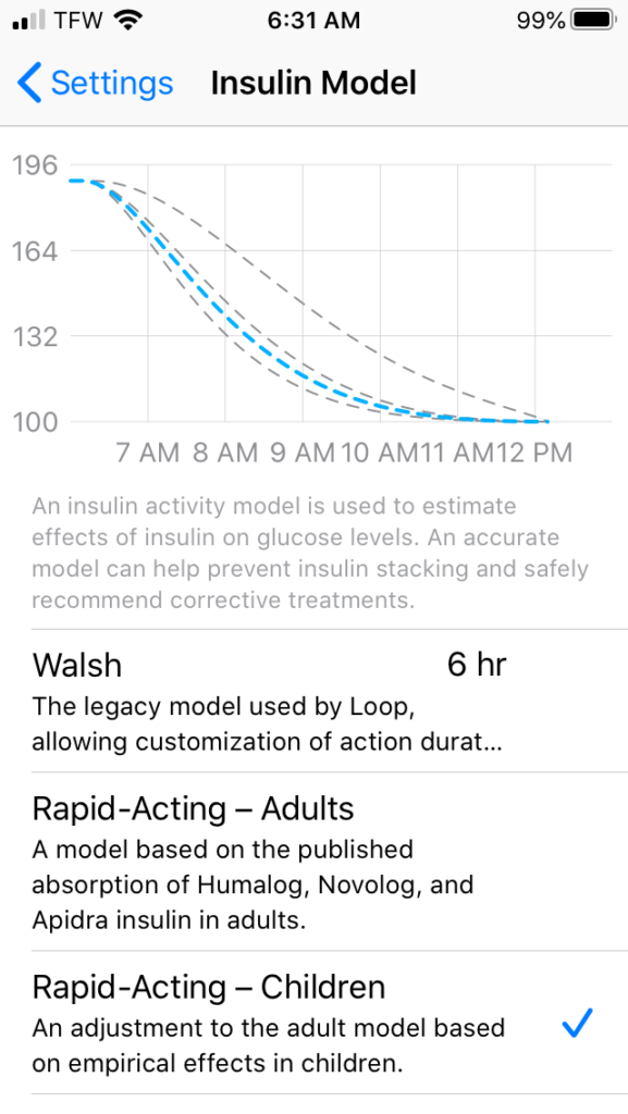 これが、血糖値予測に使う、インスリンの効果についてのアルゴリズム。いくつかのModelが用意されています。将来的にAIの技術などを使って、アルゴリズムを自動調節とかできたら、さらにすごいんだろうな。